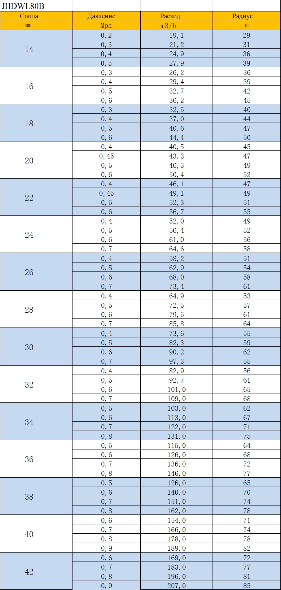 Спринклер роторный JHDWL80В, выдаёт до 207 куб/час с дальности струи до 85 метров (при условии, что на спринклер будет подано давление 9 атм). Возможность регулирования расхода воды путём смены форсунок.
